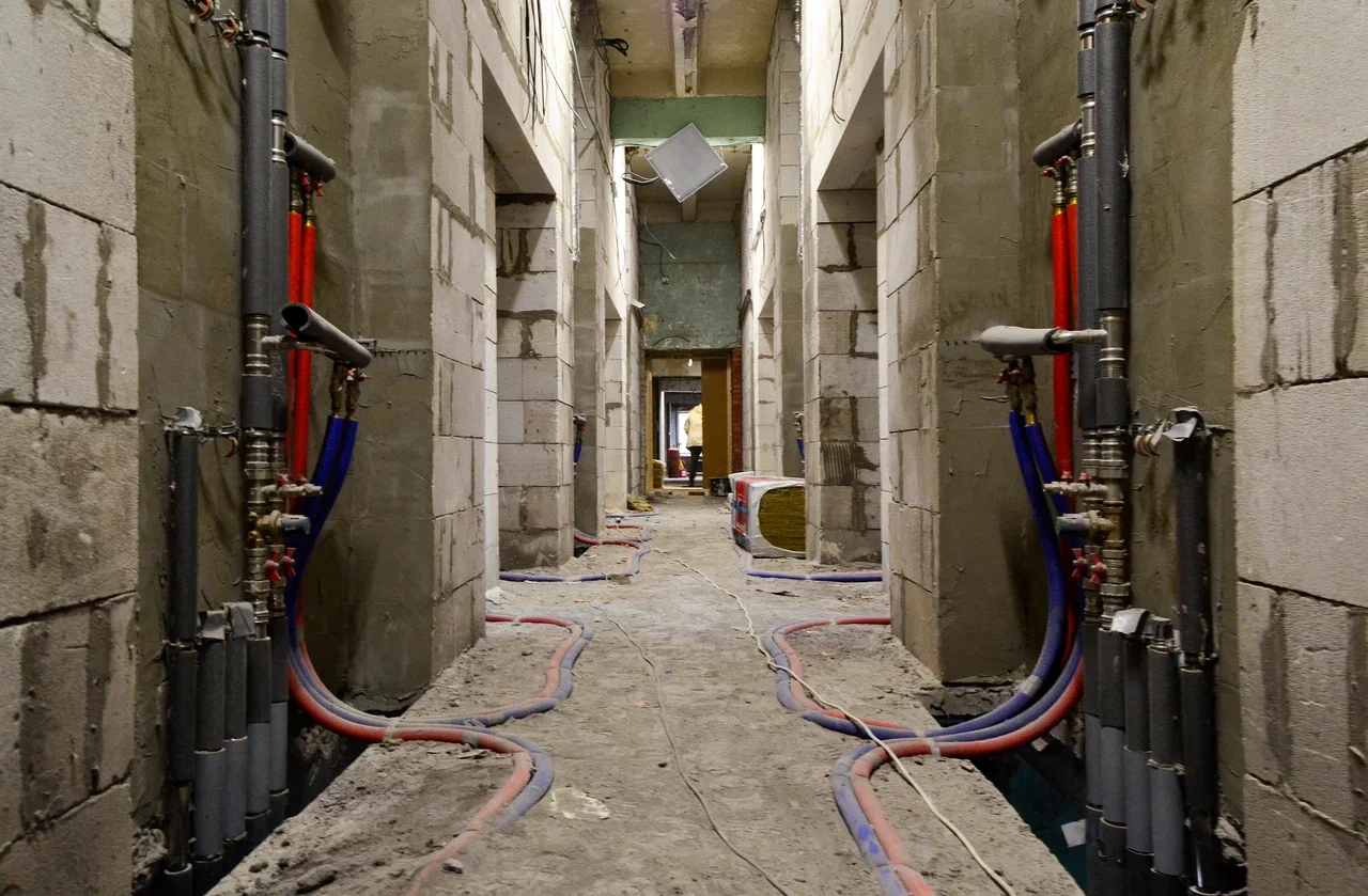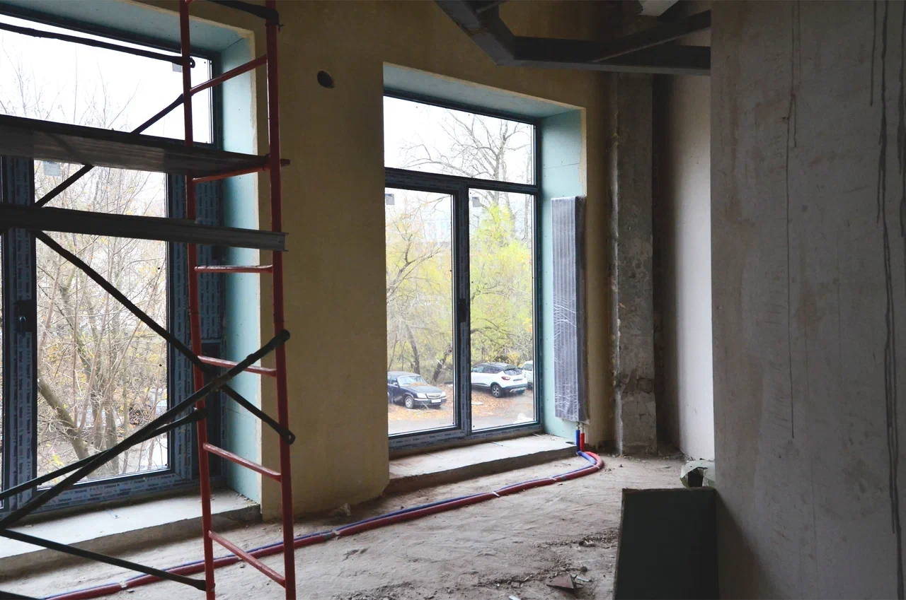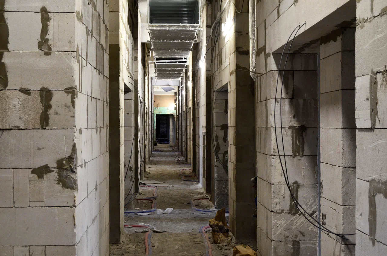 На объекте продолжаются работы по остеклению второго корпуса. Внутри здания ведётся черновая отделка — выполняются подготовительные работы под последующие инженерные и финишные этапы.